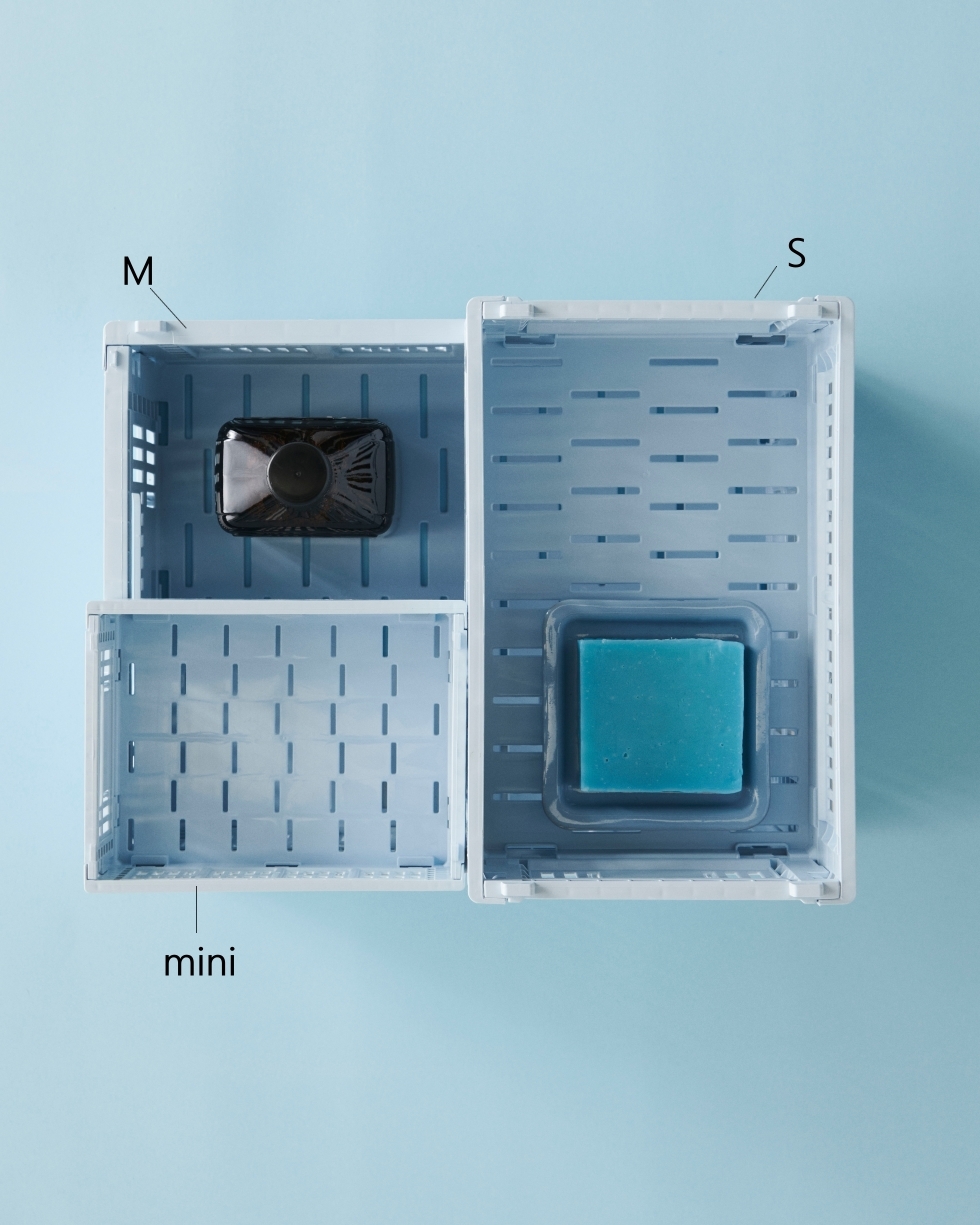 除了方形尺寸無法與長形相容,相隔尺寸的收納籃可以以 1 : 2 的方式堆疊。