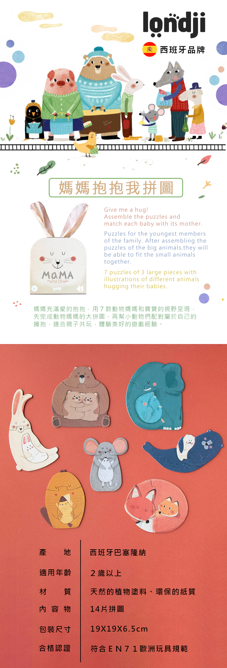 媽媽充滿愛的抱抱,用7款動物媽媽和寶寶的視野呈現,先完成動物媽媽的大拼圖,再幫小動物們配對屬於自己的擁抱