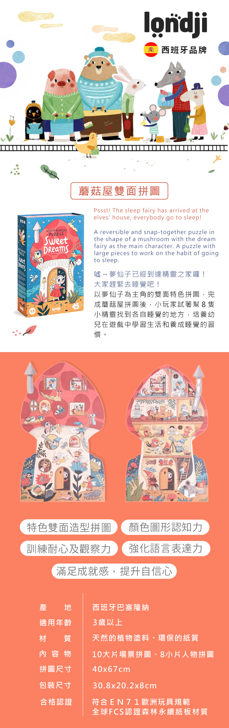 以夢仙子為主角的雙面拼圖。10片蘑菇屋完成後,再將8個精靈放入蘑菇屋內,讓精靈們安穩入睡,孩子藉此遊戲養成睡覺的習慣。每一片拼圖都非常大,專為小手設計。