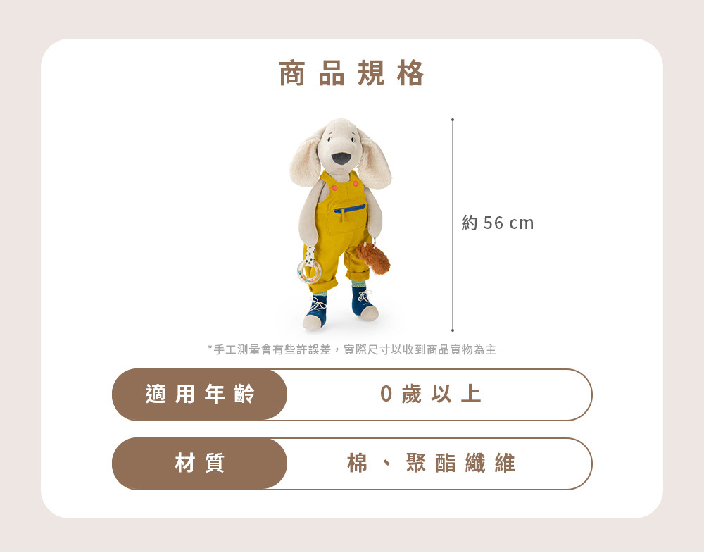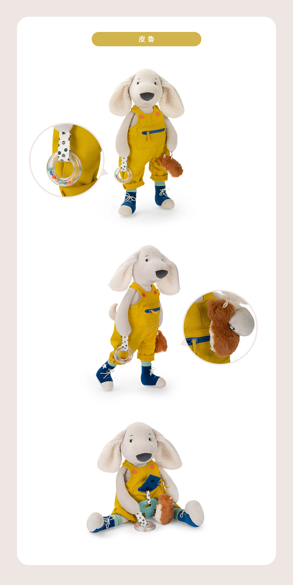 淘氣的小狗皮魯正等著小朋友來玩它的眾多遊戲:鑲有彩色珠子的環、鈴鐺、可供抓取的標籤、磨牙環,甚至還有可供擁抱的可愛花生!