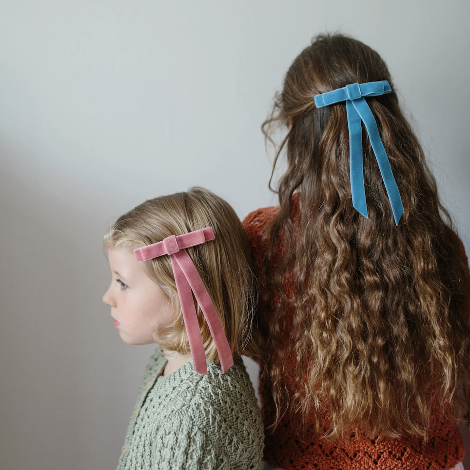手工製作的天鵝絨蝴蝶結,縫在銀色髮夾上。