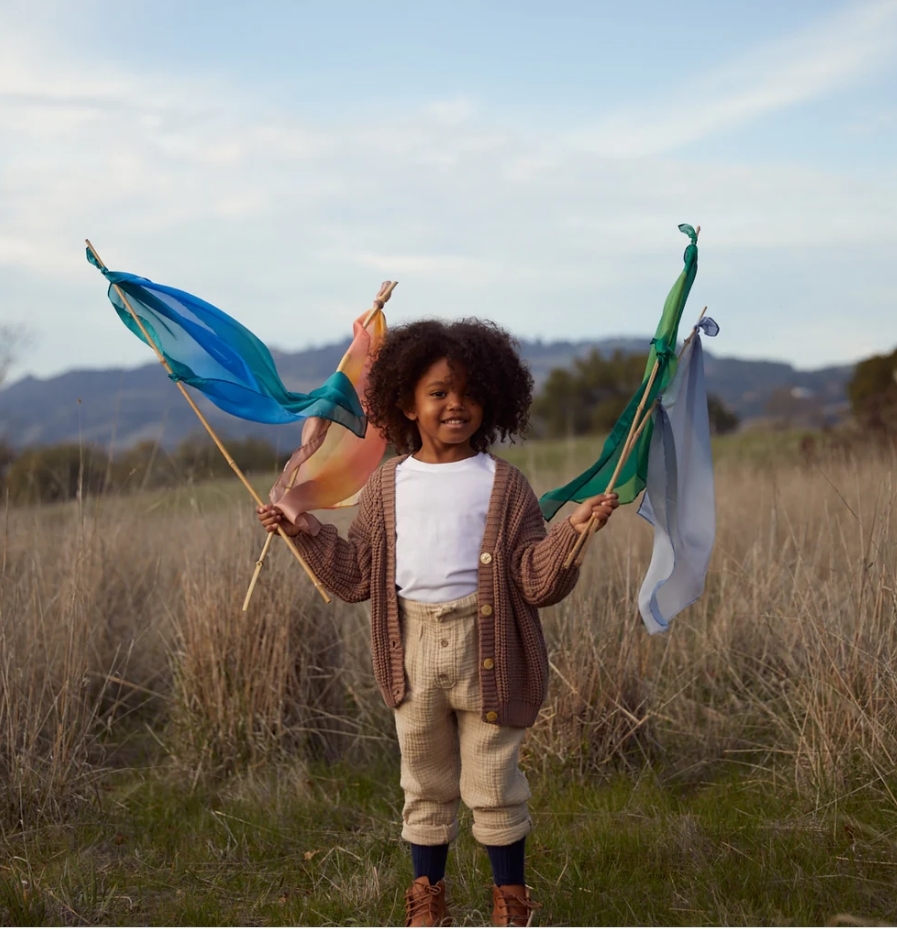 【Sarah's Silks】來自美國的家族品牌,以輕柔的絲縷為主要材質,美麗的染色增加可玩性,是許多華德福教育體系御用遊戲絲巾。